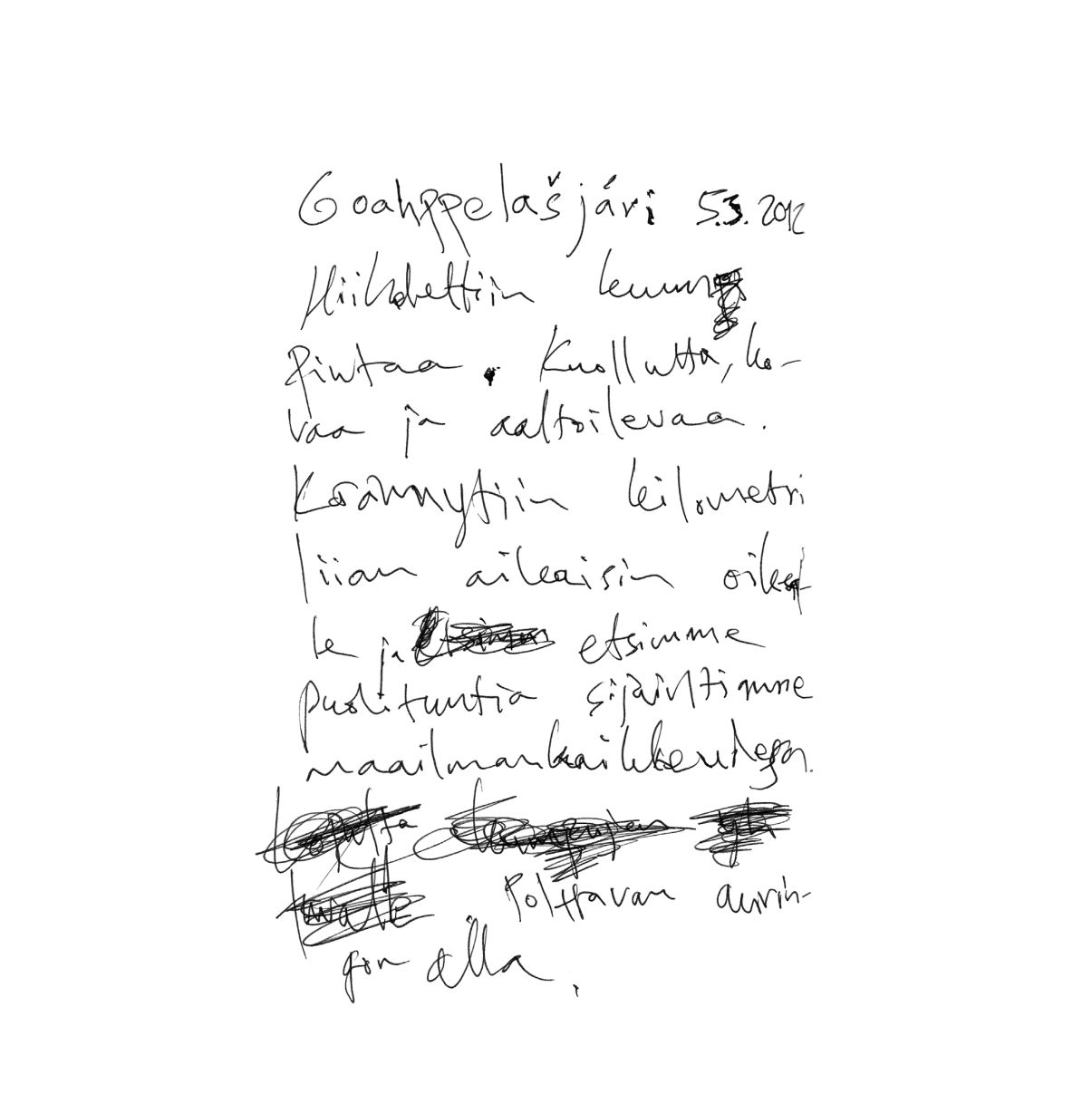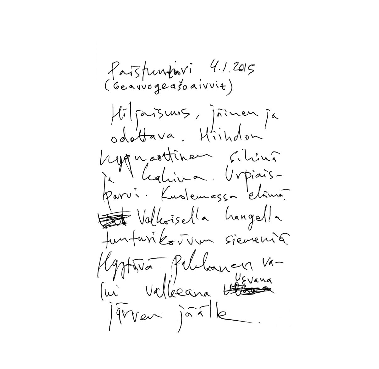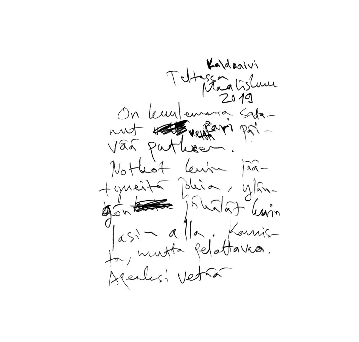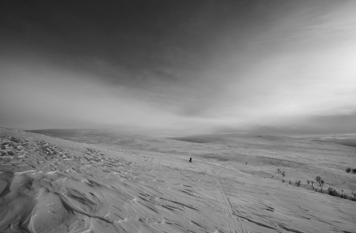"Illansuussa taivaankansi alkoi taas rakoilla. Kirkkaat säteet osuvat rinteen muotoihin. Taivaalta katsottuna olin musta piste, joka piirsi perässään janaa, kuin hyvä kynä valkoiselle paperille. Onnelliset ajatukset täyttivät pään. Alkoi tuulla uudelleen. Hiljaisuus liikkui tuulessa."